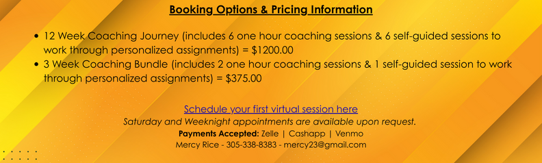 My recommendation for a coaching commitment is 12 weeks. This allows us to explore, uncover, and create a blueprint for ongoing transformation; however, you are in control of how your coaching journey progresses. You can choose to invest in the 12 week commitment or you can choose to book in 3 session increments. Booking information is detailed below.